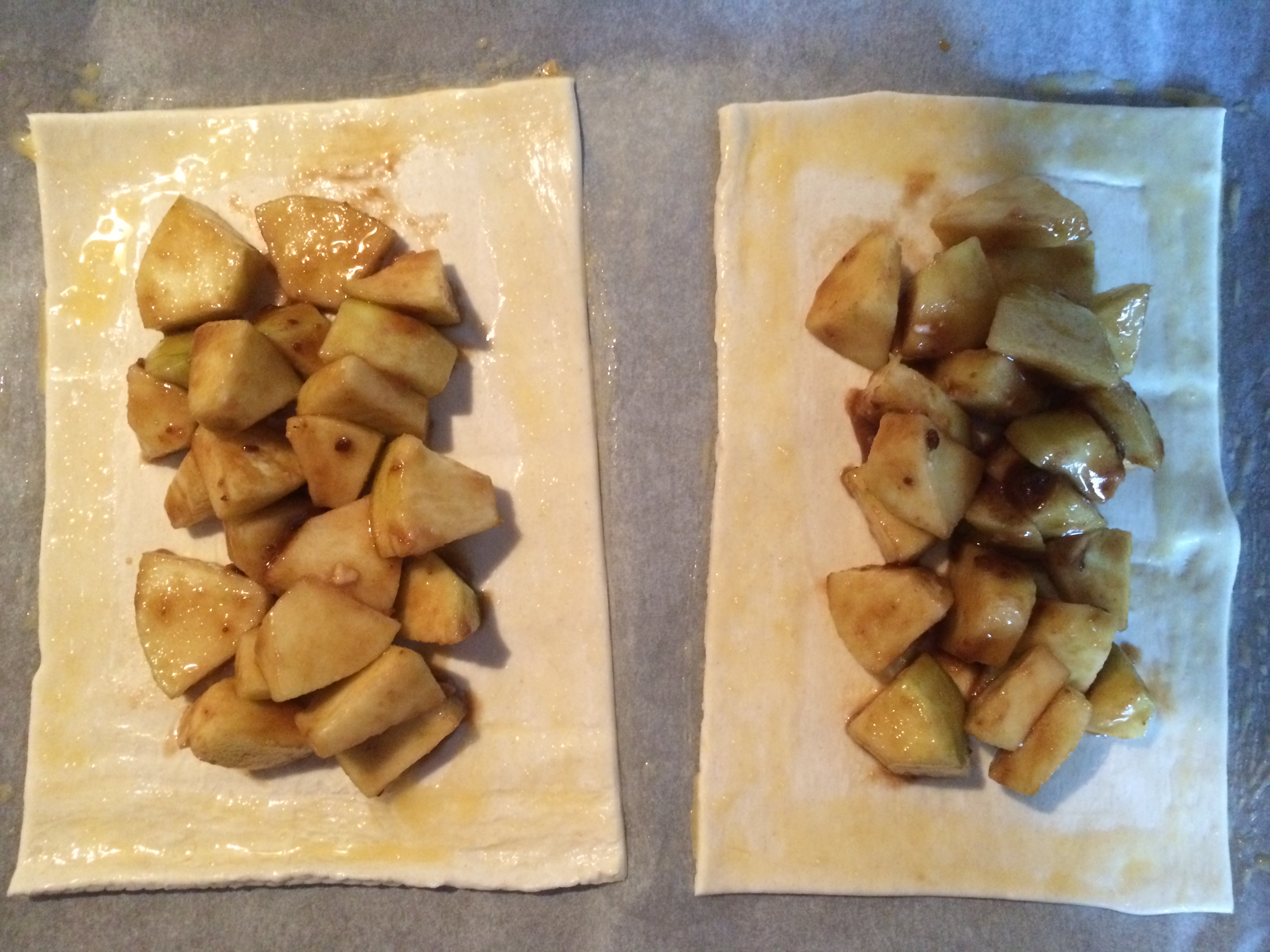Place 2 rectangles onto prepare baking tray and spoon apple mixture into the middle.