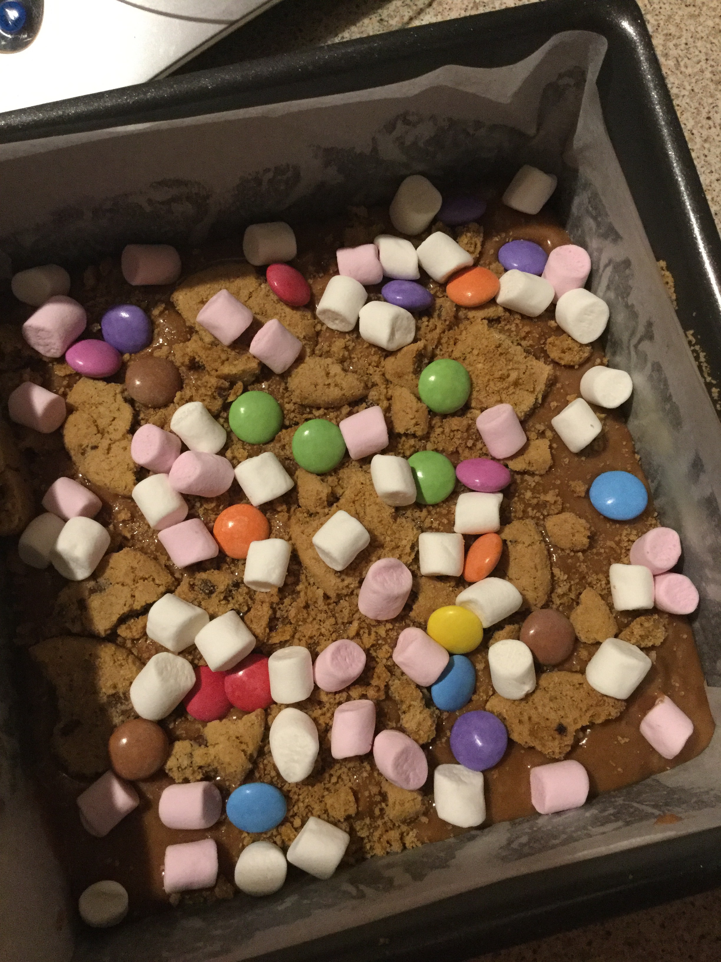 - Crush lightly the remained biscuits and scatter on top of the mixture and lightly press down and top with smarties and marshmallows.