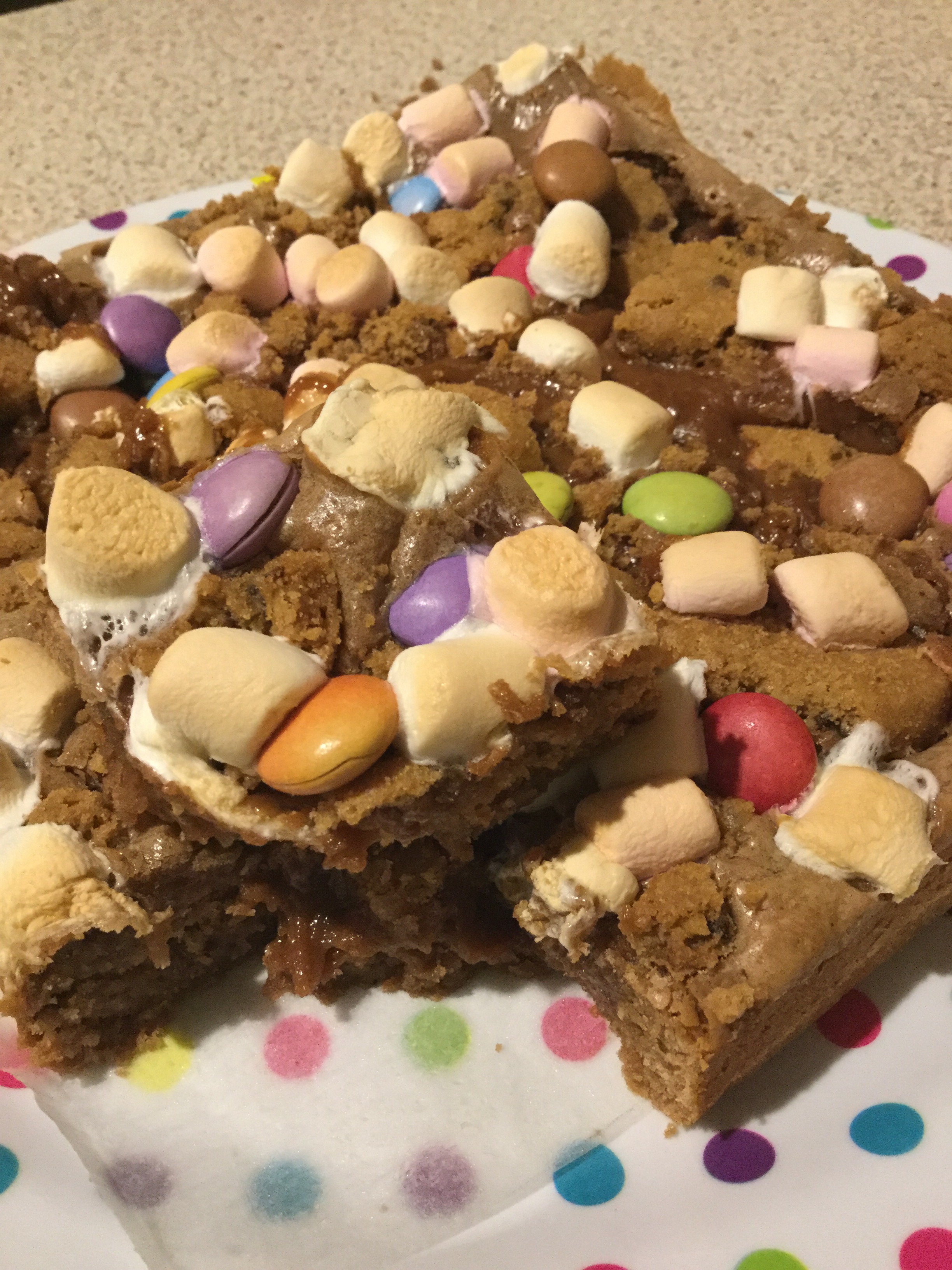 Hi and welcome to my blog, Scrummmy Friday’s. I hope you have all had a fabulous half term week and have experimented with some great recipes. If not here is one for you to try. This recipe is great for kids to help with as it involves crushing biscuits with a rolling pin and scattering smarties and marshmallows!