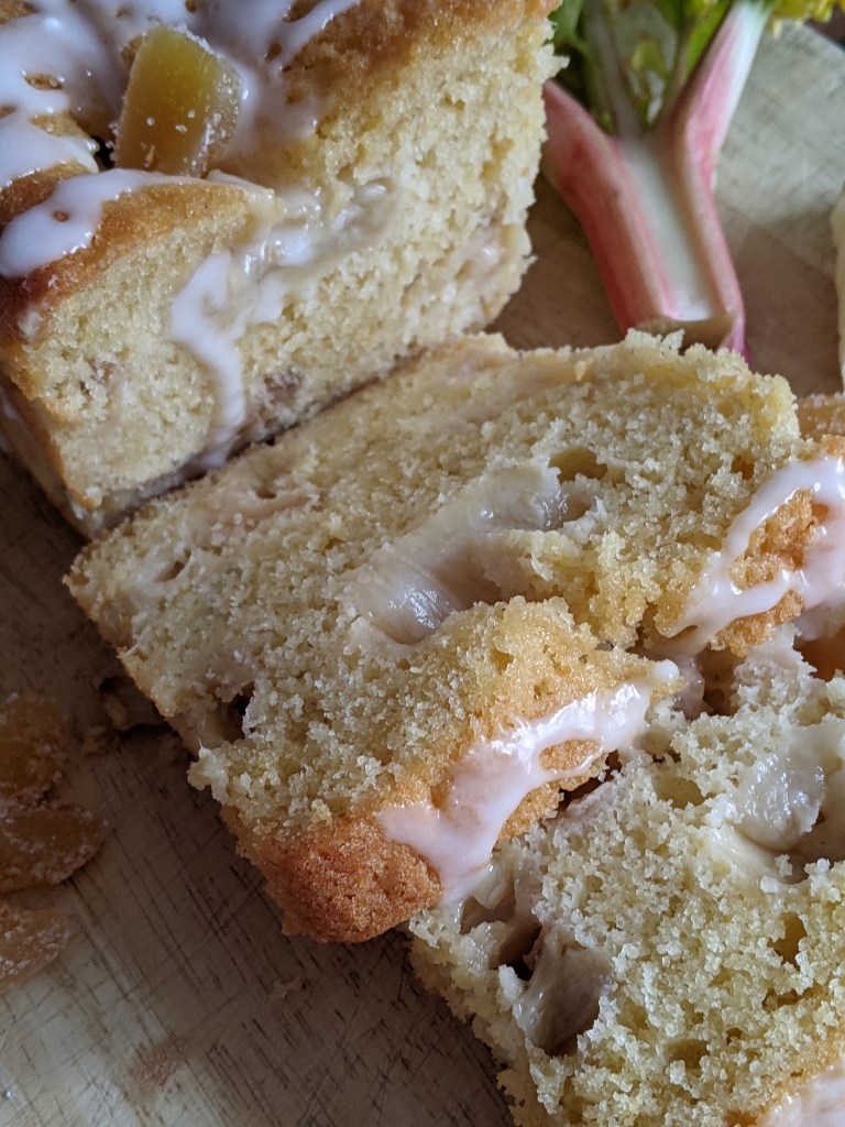 Pre-heat oven to 150 degrees C. Grease and line the tin. In a large bowl, cream the softened butter with the sugar until a light and smooth consistency. Sieve flour and a separate bowl with ground ginger. Add eggs and beat well. Fold in the flour with ground ginger and beat until smooth. Fold in fresh ginger and rhubarb. Please cake mix in to the tin and place in the oven for 1 hour – 1 hour 15 mins or until a skewer comes out clean. Place on a cooling rack for 10-15 mins, then turn out the cake from the tin and allow to cool completely (which is really hard to do, if you are like me, a slice of warm cake is heavenly!) In a bowl add a small amount of icing sugar and with lemon juice and drizzle over the top of the cooled cake and decorate with the sugar coated stem ginger.