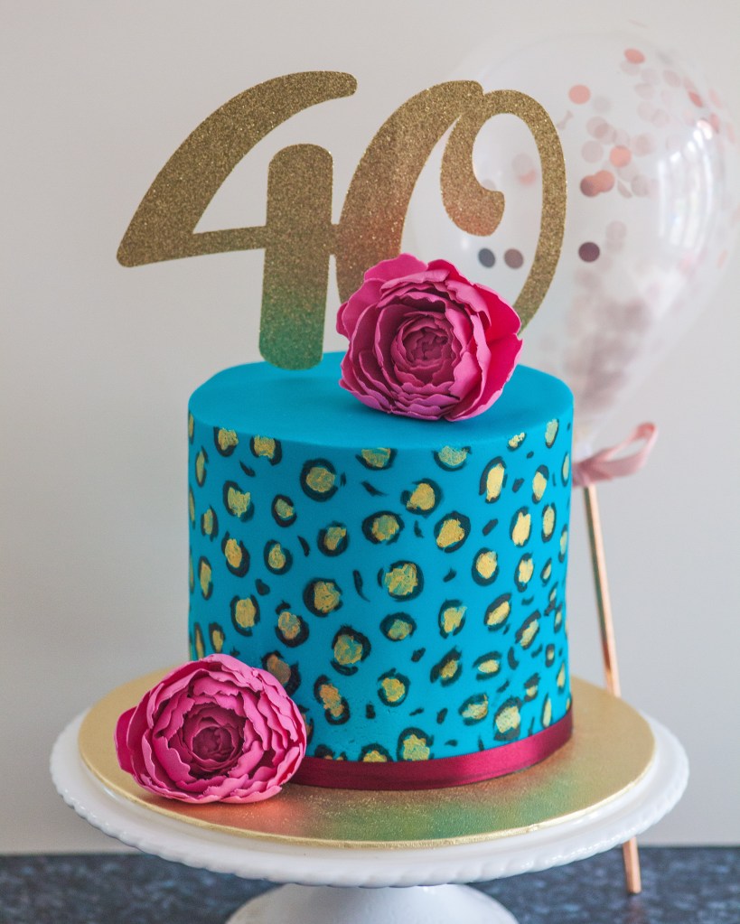 The featured picture was (as I’ve eaten it all) my birthday cake, made by me. 4 deep layers of vanilla sponge, raspberry jam and lactose free vanilla buttercream, making that cake stand 6 inches tall. The flowers are my own creative work too, handmade sugar craft closed peonies. All in my favourite colours, turquoise and claret, with the added sparkle of gold. The leopard print is free hand painted with edible paint. Simple flavours, elegant design.