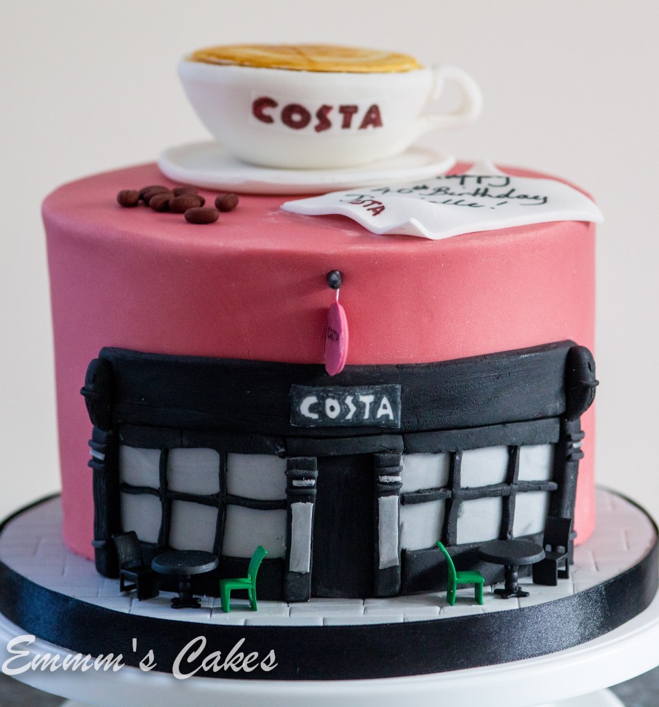 So to keep this short, today’s meet the maker post should be “newest make”. So this week’s bake was this Costa coffee celebration cake. The brief was from a Danielle’s husband and children, to make a 40th birthday cake of a Costa Coffee shop front, specifically the one she used to frequent before lockdown.